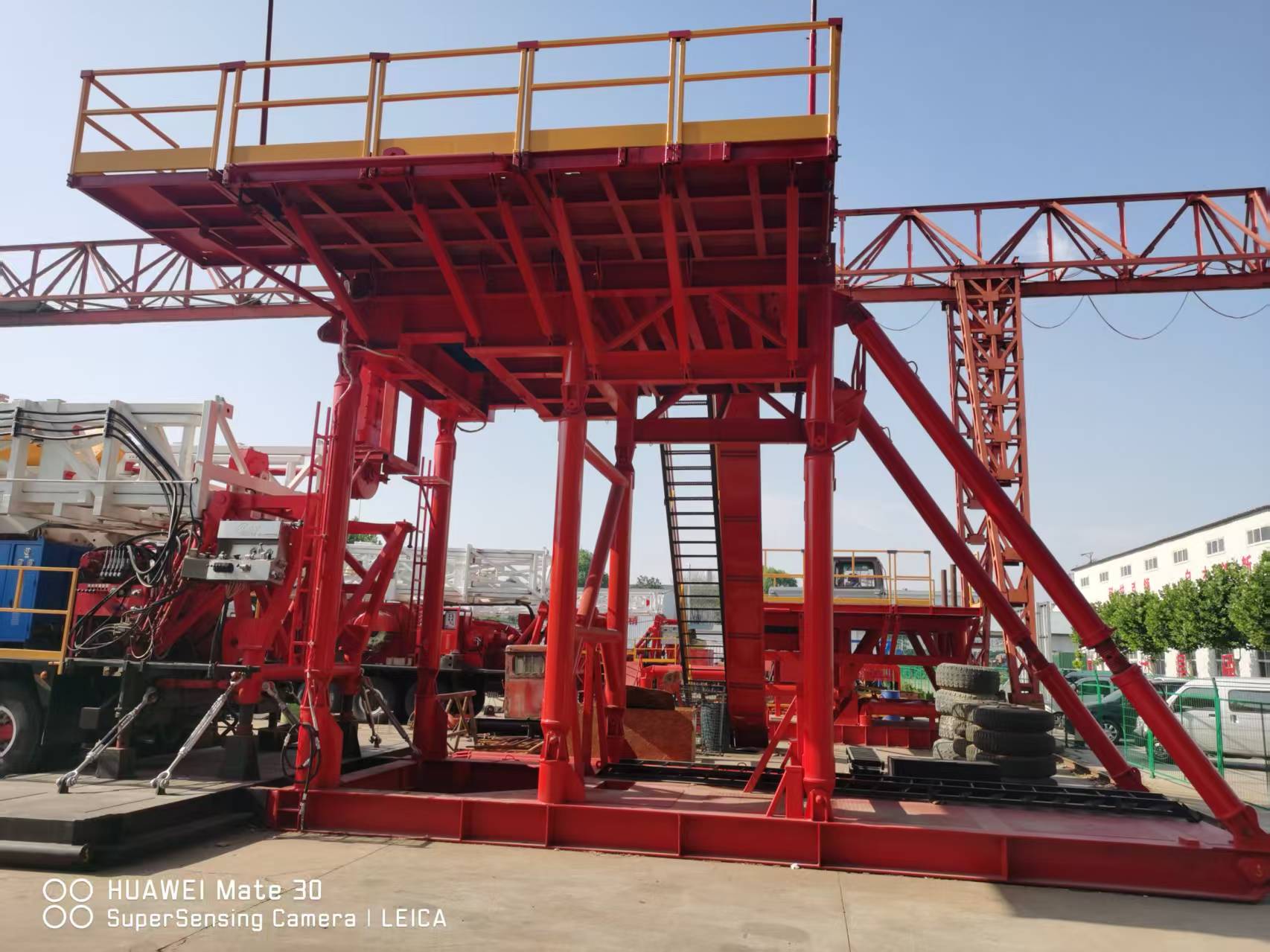4. 井架采用前开口双节套装桅形井架,前倾或直立,液压缸起放及伸缩,配有防风绷绳及防翻绷绳。