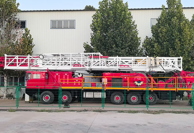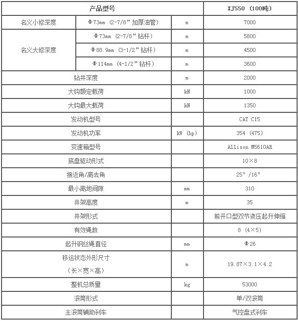 XJ550(100吨)修井机是油田钻修井用的专用设备,底盘采用10×8驱动形式,动力机组采用卡特柴油机和艾里逊变速箱,绞车采用双滚筒结构。大钩最大载荷1350kN。井架为矩形管门形双节套装结构,高度35m,配备二层台。整机可选配转盘、钻台、水龙头等钻井部件,可以独立完成钻井作业。
